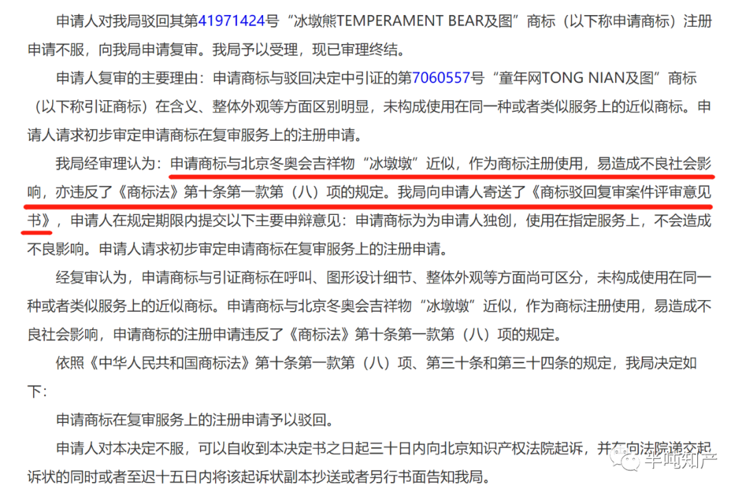 在2021年度商标异议和评审典型案中也出现了增加驳回理由的情况,“打击涉嫌抄袭摹仿北京2022年冬奥会和冬残奥会吉祥物,易造成不良社会影响的第41971424号“冰墩熊Temperament Bear及图”商标驳回复审案“,这个商标的申请人对程序可能更加不满,原先的驳回理由已经克服,想着商标可能要到手了,又遇到增加驳回理由的情况。 |