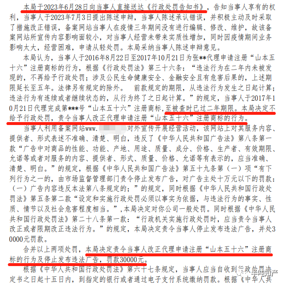 现在时间过去7年之久,处罚照样来了,由于到被查时已过二年期限,代理“山本五十六”商标,不予行政处罚,责令改正,但由于其无专利、版权代理资质却在其网站宣城专利代理事宜,合并处罚改正不当代理行为及停止发布违法广告,罚款3万元。 代理商标无小事,一个不小心,就造成社会巨大不良影响,所以,申请前还是要做好检索工作,最好每个名称都检索一下其含义,至少避免处罚吧。 |