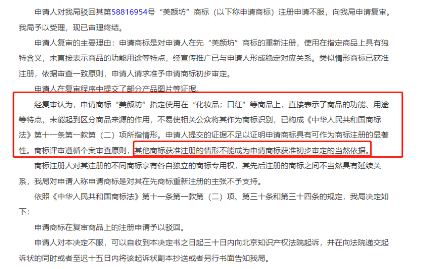 驳回理由:违反《商标法》第十一条 (二)仅直接表示商品的质量、主要原料、功能、用途、重量、数量及其他特点的;不得作为商标注册 案例三: