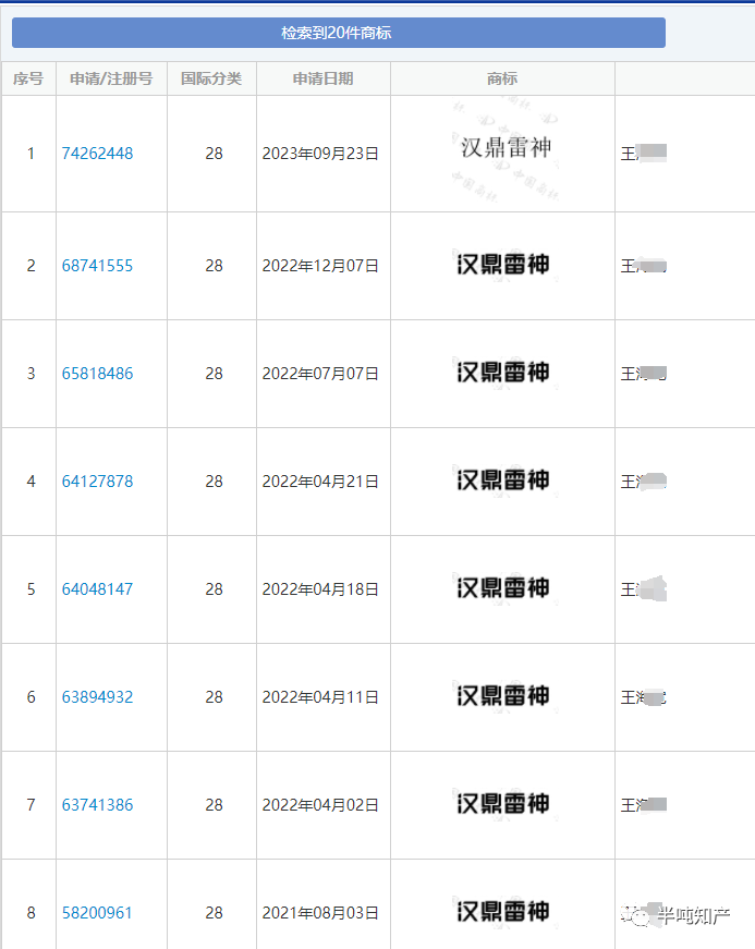 可仔细深究下去,发现事情没有那么简单,一起看下具体情况,说河北一家代理机构,代理了王某在第28类上共计20件“汉鼎雷神”,是的,你没看过,甚至商品项目都一样,其中有11件都初审公告。