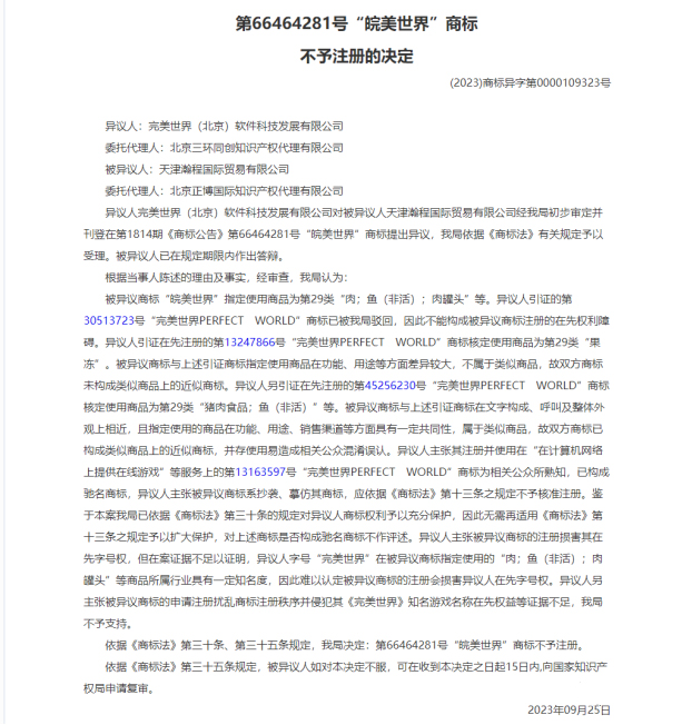 | 商标“皖美世界”碰撞《完美世界》被异议。 | |