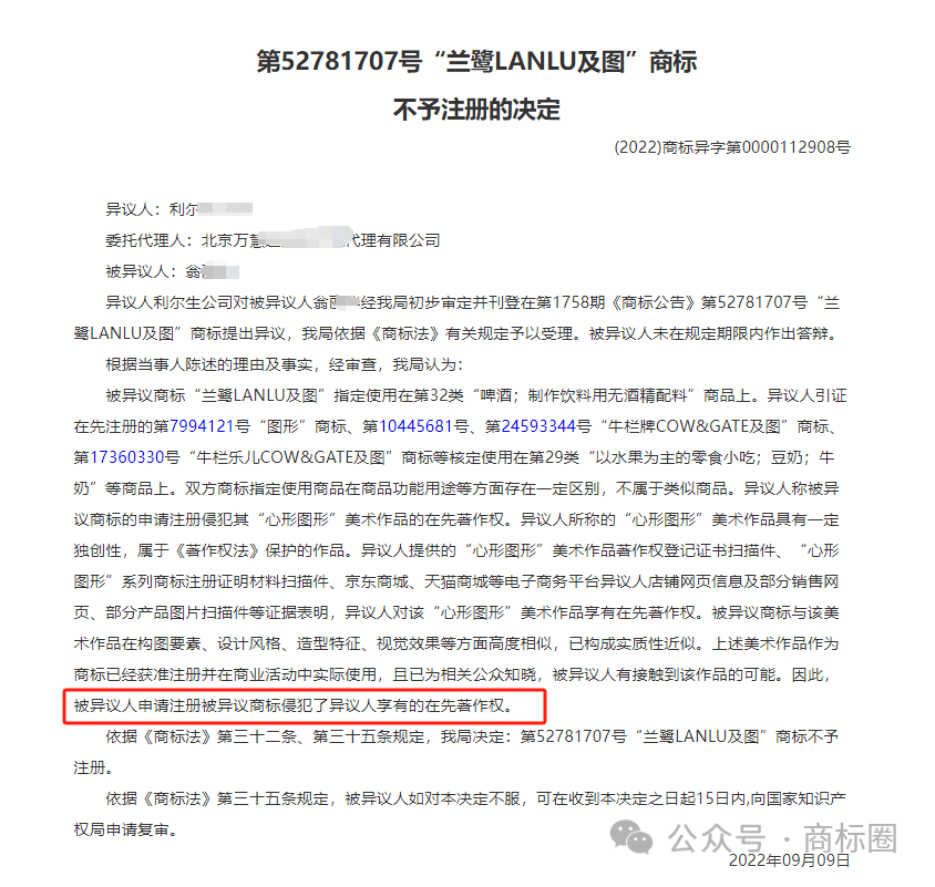 最后裁定,被异议人申请注册被异议商标侵犯了异议人享有的在先著作权。依据《商标法》第三十二条、第三十五条规定,我局决定:第52781707兰鹭LANLU及图商标不予注册。
