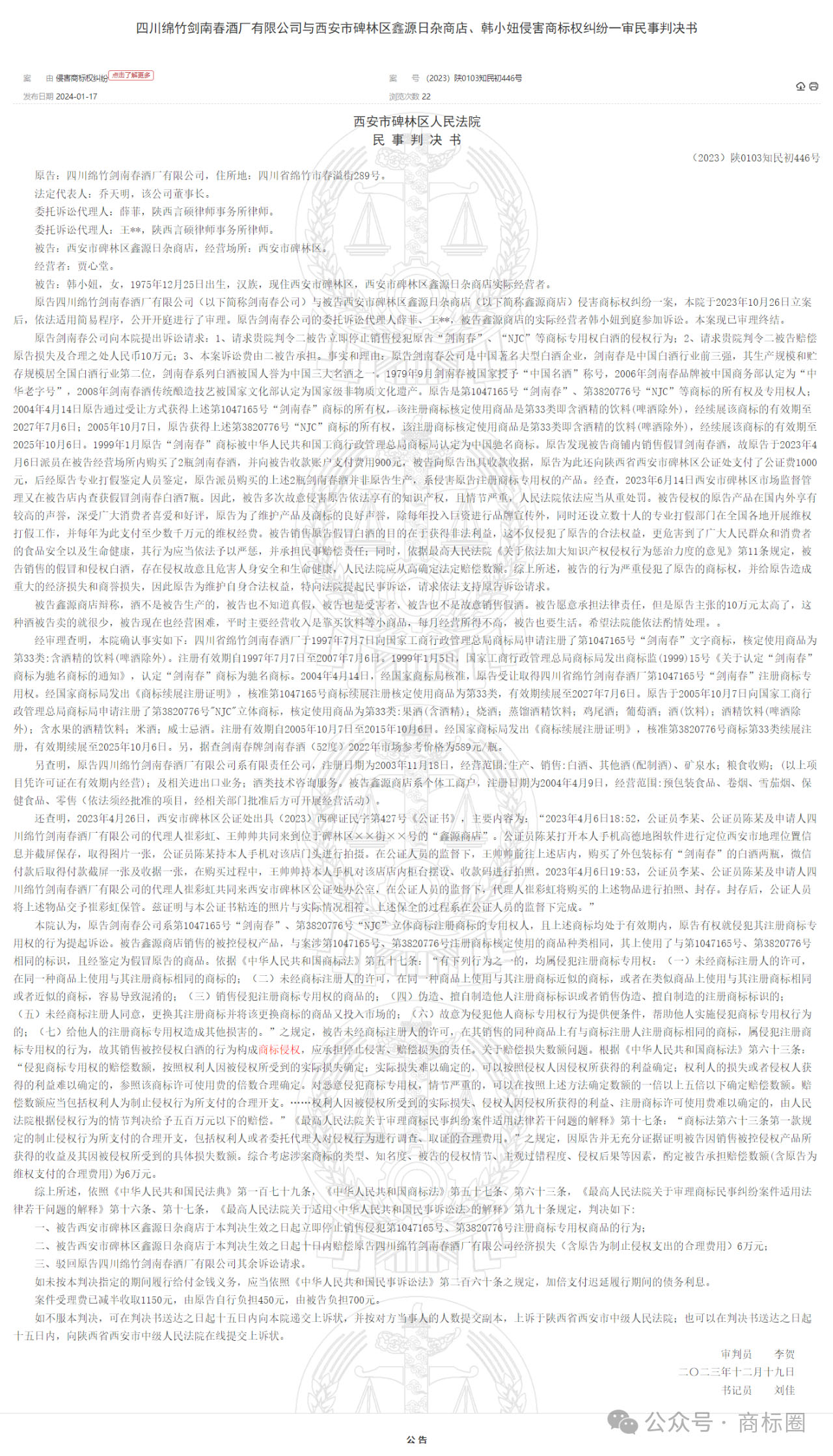 原告为四川绵竹剑南春酒厂有限公司,剑南春是中国著名大型白酒企业,是中国白酒行业前三强,其生产规模和贮存规模居全国白酒行业第二位,剑南春系列白酒被国人誉为中国三大名酒之一 被告为陕西省西安市碑林区的一家杂货店以及其经营者 原告剑南春发现被告店铺里有销售假冒剑南春酒,故原告于2023年4月6日派人员在公证处公证人员的见证下到被告经营场所内购买了2瓶剑南春酒,并专门委托第三方进行鉴定,果然鉴定结果为购买的2瓶“剑南春”均为假酒,系侵害原告注册商标专用权的产品。 另外原告查询到2023年6月14日西安市碑林区市场监督管理又在被告店内查获假冒剑南春白酒7瓶。因此,原告认为被告多次故意侵害原告依法享有的知识产权,且情节严重,人民法院依法应当从重处罚。 但是被告鑫源商店辩称,酒不是被告生产的,被告也不知道真假,被告也是受害者,被告也不是故意销售假酒。不过被告也议案以承担相应的责任只是希望法院能依法酌情处理。