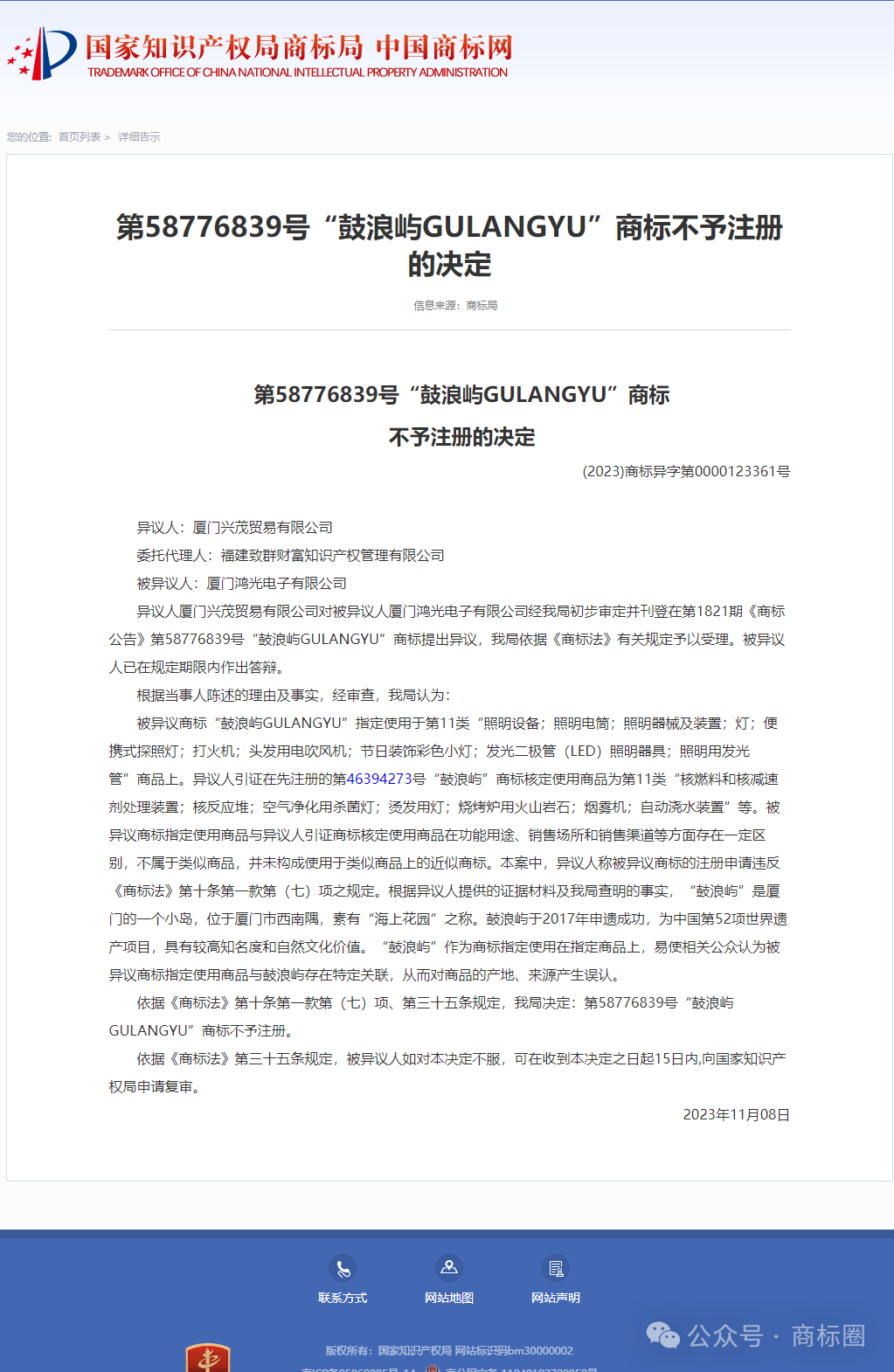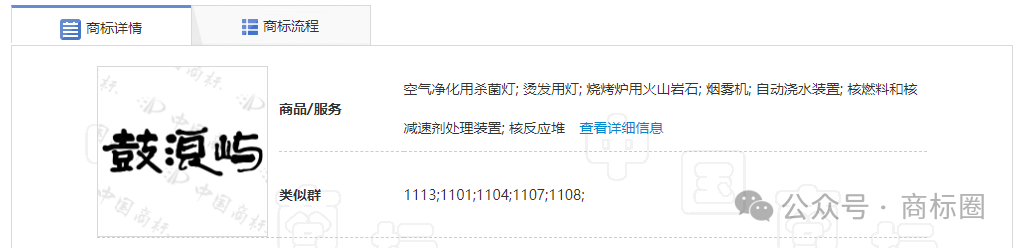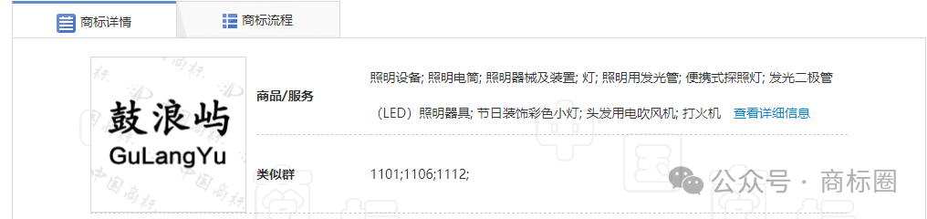 近日,一则关于“鼓浪屿”商标被驳回案引起了圈圈的关注,被异议商标“鼓浪屿”指定使用在照明设备; 照明电筒; 照明器械及装置; ; 照明用发光管; 便携式探照灯; 发光二极管(LED)照明器具; 节日装饰彩色小灯; 头发用电吹风机; 打火机商品上,异议人引证在先注册的第46394273号“鼓浪屿”商标核定使用商品为第11类“核燃料和核减速剂处理装置;核反应堆;等