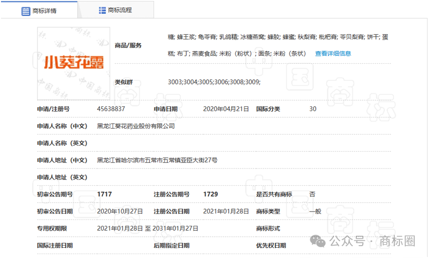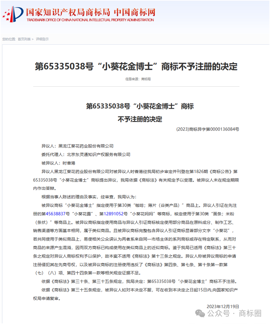 葵花药业不仅在药品行业注册了小葵花品牌,还在其他类别注册了大量相关的商标,做到了全面的保护。 葵花药业如此全面的保护也没避免别人来注册相关的商标,近日商标局的网站上公布了第65335038号“小葵花金博士”商标初审通过了,葵花药业监控到了后对该商标提出异议申请。 经商标局审理认为:被异议商标“小葵花金博士”指定使用于第30类“咖啡;薄片(谷类产品)”商品上。异议人引证在先注册的第45638837号“小葵花露”、第12891052号“小葵花妈妈”等商标,核定使用于第30类“面条;米粉(条状)”等商品上。 被异议商标指定使用商品与异议人引证商标核定使用部分商品在原料成分、制作工艺、销售渠道等方面基本相同,属于类似商品。且被异议商标完整包含异议人引证商标显著部分文字“小葵花”,若共同使用于类似商品上,易使相关公众误认为两者系来自同一市场主体的系列商标或存在特定联系,从而对商品的来源产生混淆,因而双方商标已构成使用在类似商品上的近似商标。 鉴于我局已适用《商标法》第三十条之规定对异议人商标权利予以保护,故本案不适用《商标法》第十三条之规定。异议人称被异议商标的申请注册侵犯其在先商号权,以及被异议商标的注册使用违反了《商标法》第四条、第七条、第十条第一款第(七)(八)项、第四十四条第一款等相关规定证据不足。 依据《商标法》第三十条、第三十五条规定,我局决定:第65335038号“小葵花金博士”商标不予注册。 知名企业都不能避免这种情况,所以我们更要全面的保护自己的品牌,也要善于利用商标法条如:异议、无效、撤三等。
